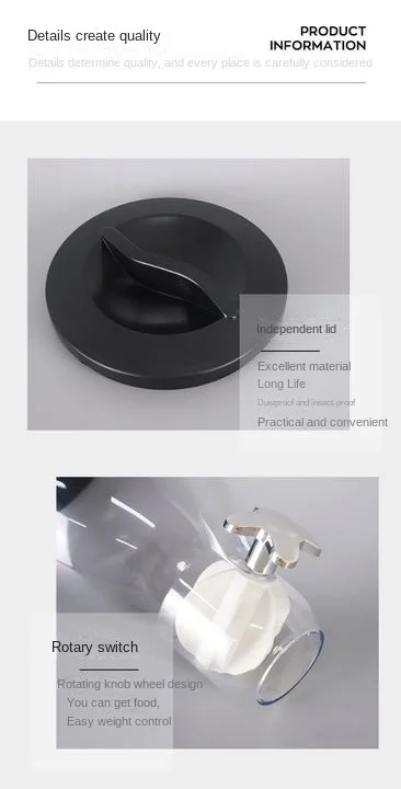 Features:: With a transparent body design, you can see the food in the storage container. There is a good sealing design. And with a funnel type bottle mouth and large diameter design, you can concentrate on dumping food.