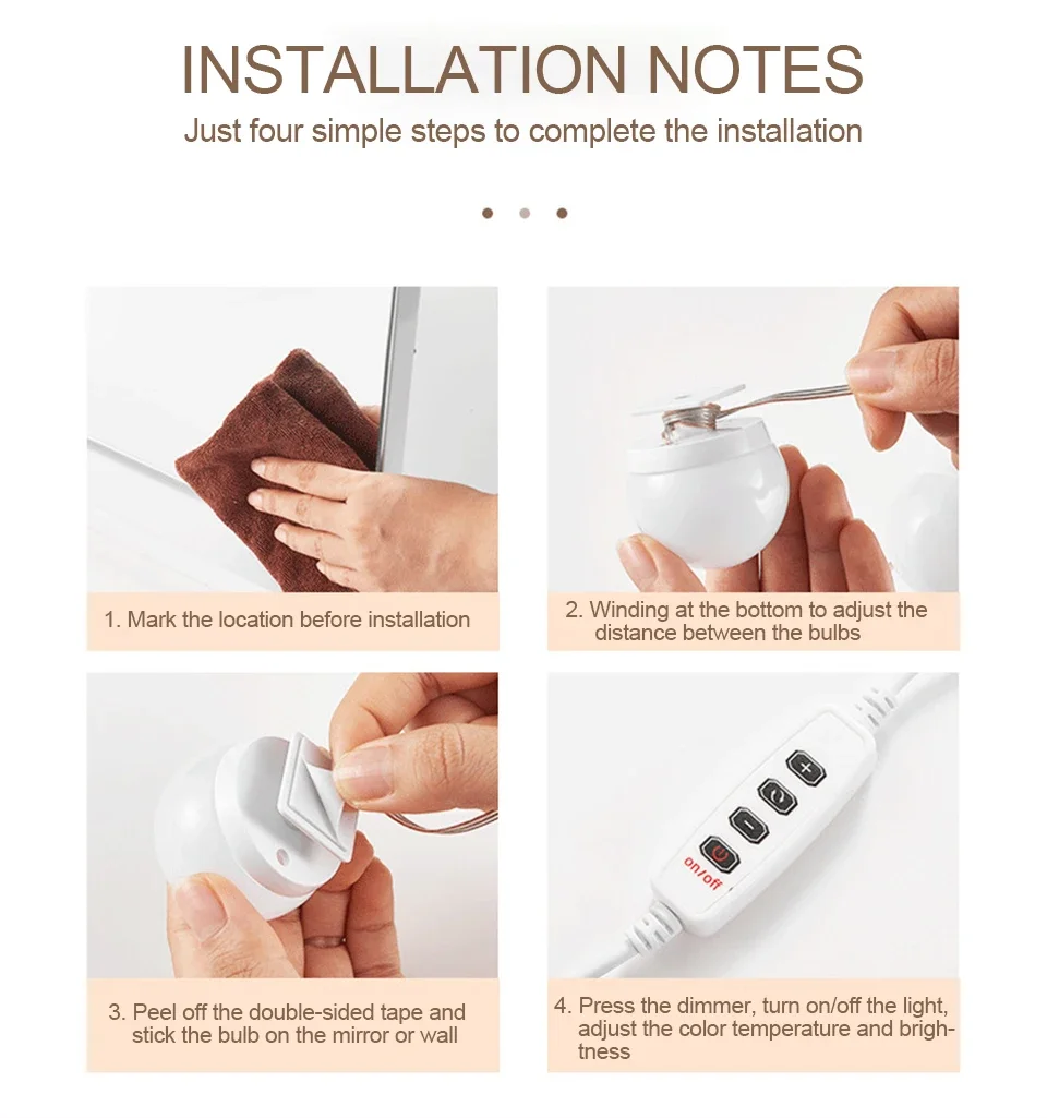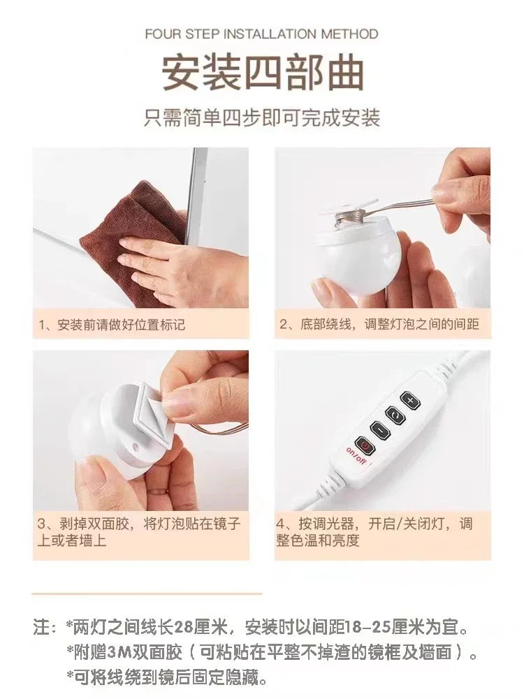 Nordic Vanity Mirror Fill Light Adjustable Luminance 3 Colors LED USB Wall Bulbs String For All Pretty 3 Colors Dimmable Light